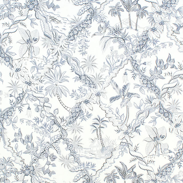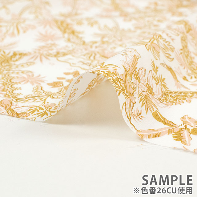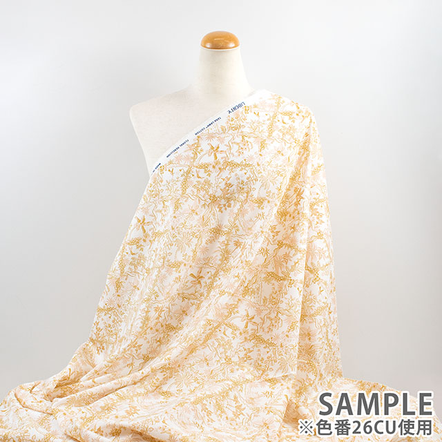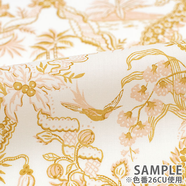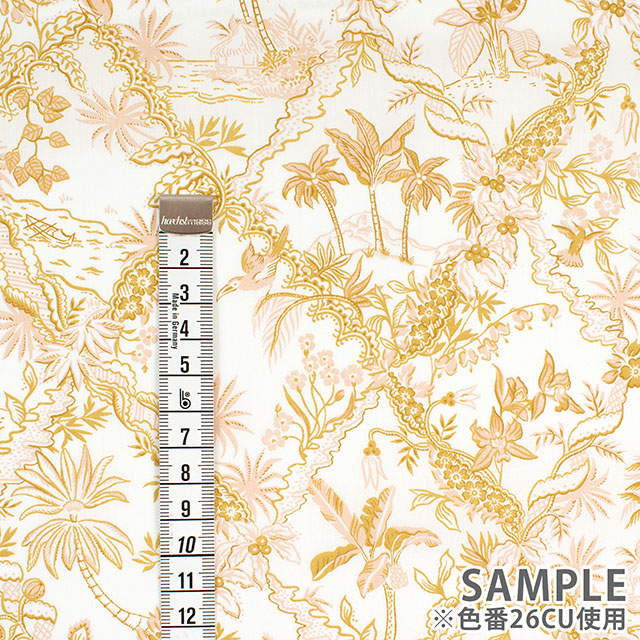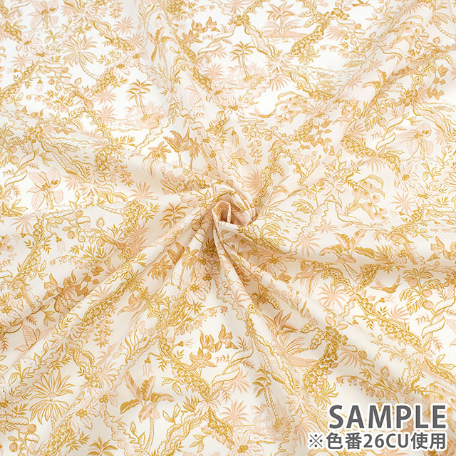 リバティのデザインスタジオで制作されたこのトワール・ド・ジュイ風のパターンは、熱帯の植物や動物が描かれた繊細な風景が特徴です。