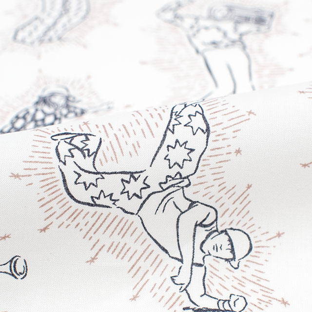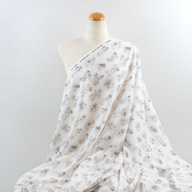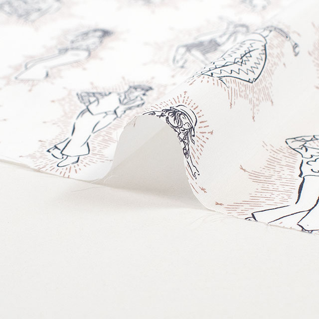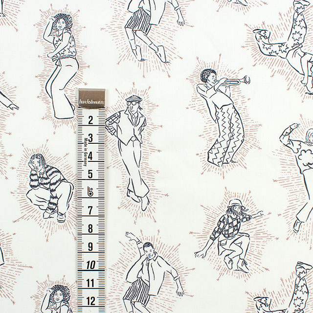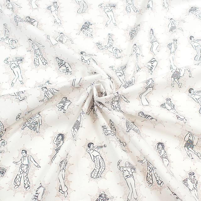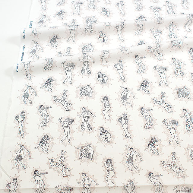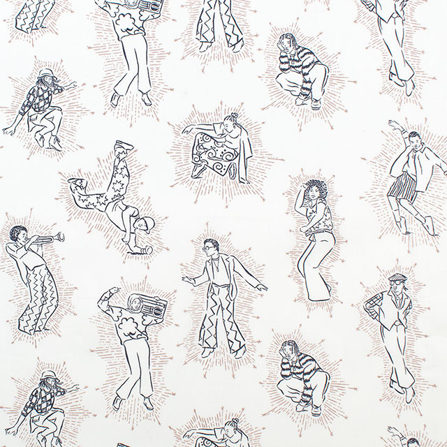リバティデザインスタジオで手描きされたこのユニークでカンバセーショナルなプリントは、音楽のビートに合わせて流れるように動く想像上のダンサーたちを表現しています。