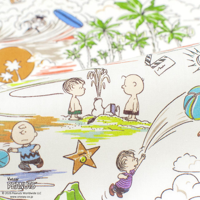 ヤシの木や金色の砂浜、波が広がる美しい風景を背景に、スヌーピーと仲間たちがサーフィン、バスケットボール、映画鑑賞、夕日を楽しむ姿が描かれています。