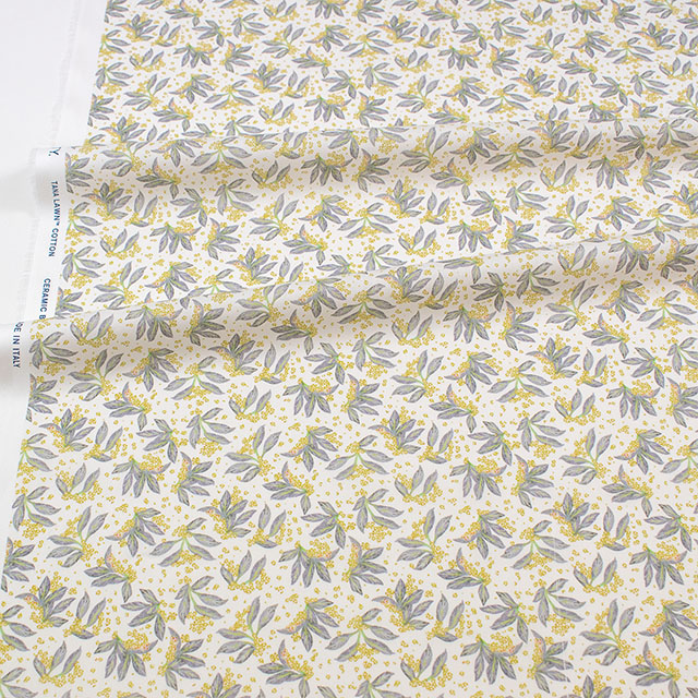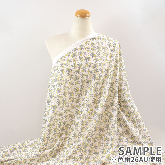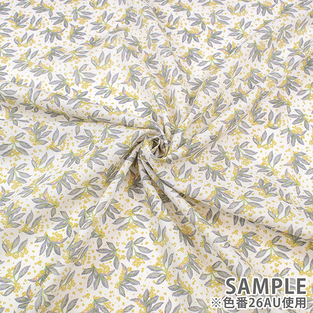 リバティのスタジオで手描きされたこのデザインは、多方向に構成された葉の流れと、きらめくように描かれたワスレナグサが印象的です。