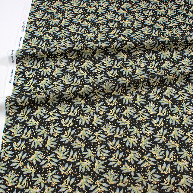 リバティのスタジオで手描きされたこのデザインは、多方向に構成された葉の流れと、きらめくように描かれたワスレナグサが印象的です。