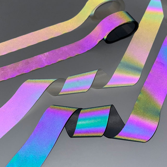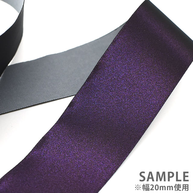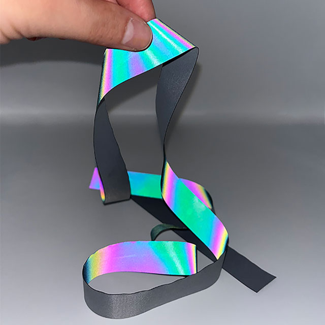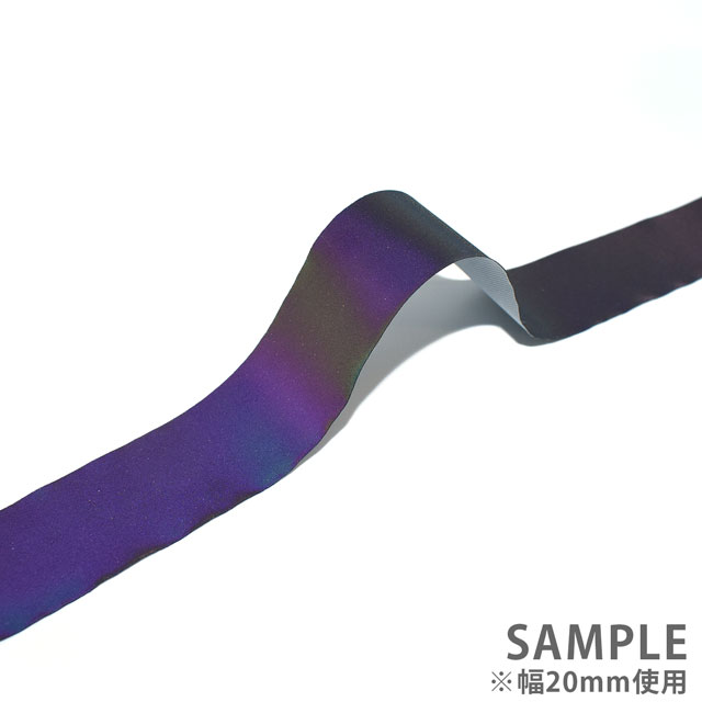 フラッシュライトをあてるとオーロラのように光って見える生地「オーロラリフレクター」を20mm幅にスリット(裁断)したテープです。