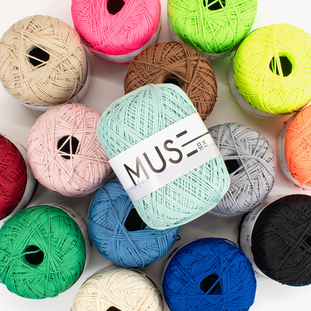 韓国の毛糸ショップ、Yarn-aのMuseは、しっとりと光沢感のあるポリエステルの手編み糸です。