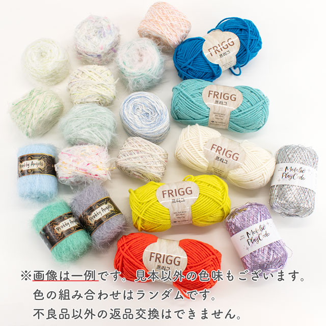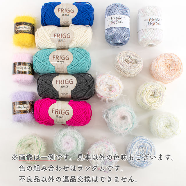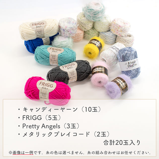 色んな素材がミックスされた引き揃え糸「キャンディーヤーン」や、大人気の「メタリックプレイコード」、ふんわりした毛羽のあるベルベットタイプの「FRIGG」、引き揃え用におすすめのファータイプの糸「Pretty Angels」の4種の毛糸が合計20玉入っています。