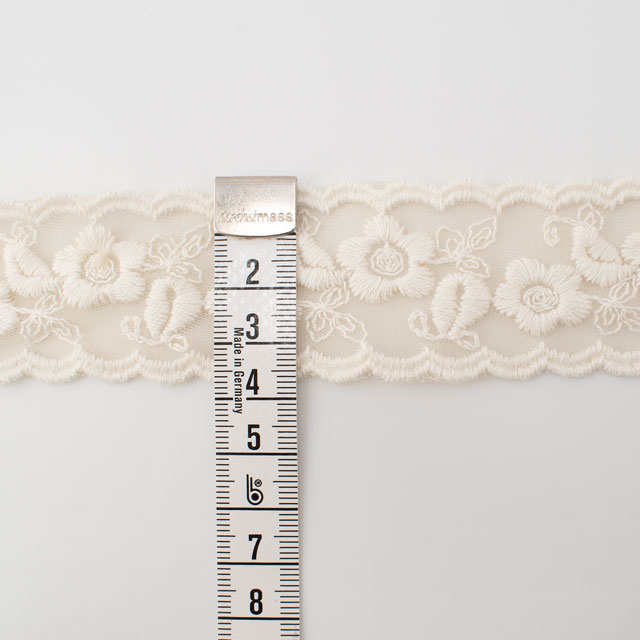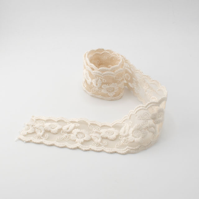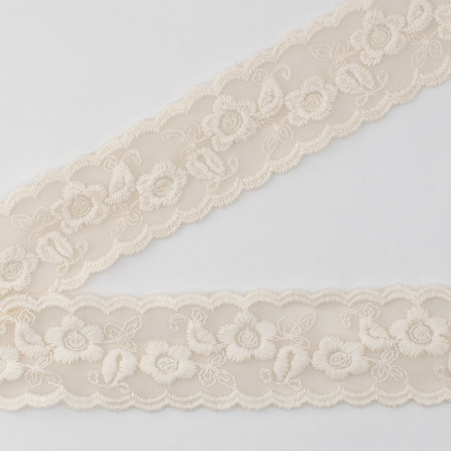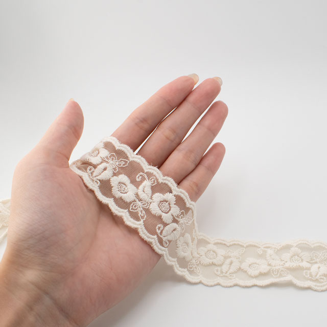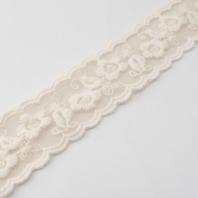 目の細かいチュールネットに太糸で刺繍した、手刺繍感のあるぽってりとしたチュールレースです。