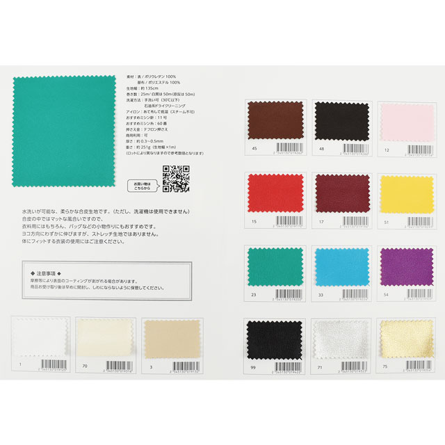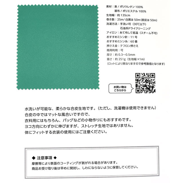 合皮の中ではマットな風合いですので、衣料用にはもちろん、バッグなどの小物作りにもオススメです。