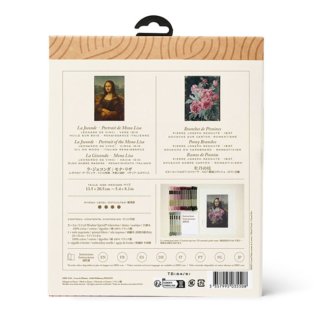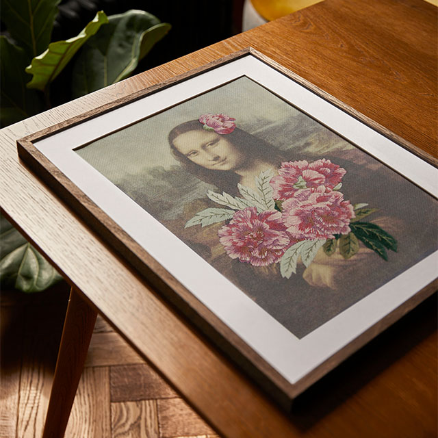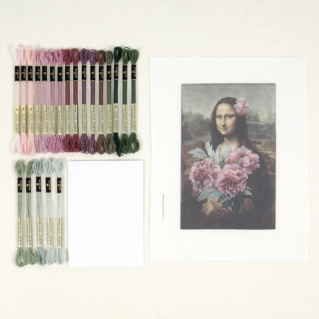 レオナルド・ダ・ヴィンチの「モナ・リザ」と、ピエール=ジョゼフ・ルドゥーテによる「牡丹の枝」を合わせた遊び心のあるデザインの刺しゅうキット。