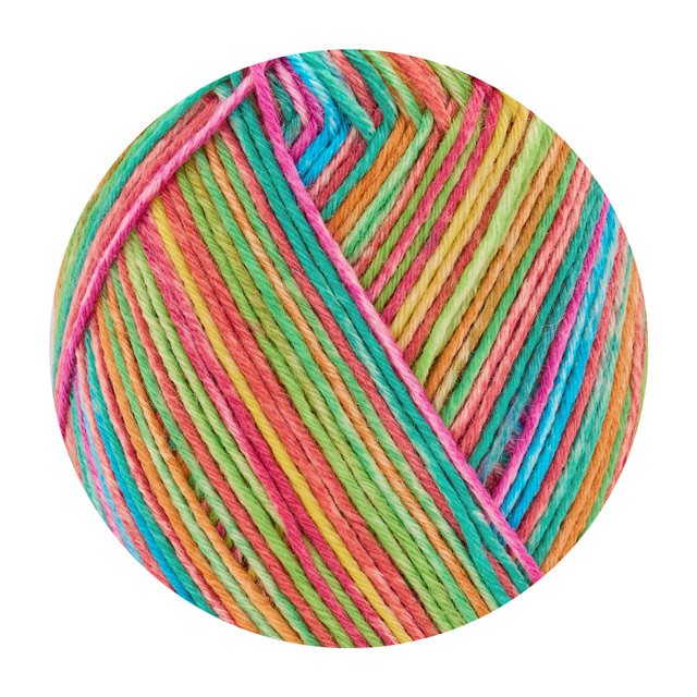 ドイツ生まれのカラフルな段染め毛糸。シンプルに編むだけでカラフルな模様が浮かびあがります。
