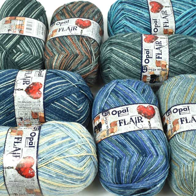 Opal毛糸というとカラフルな段染め毛糸がぱっと思い浮かぶかと思いますが、「フレア」は短めのリピートと調和のとれた落ち着いた色味が印象的なちょっと珍しいシリーズです。