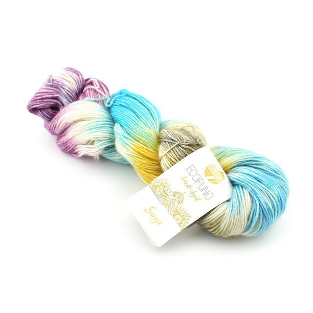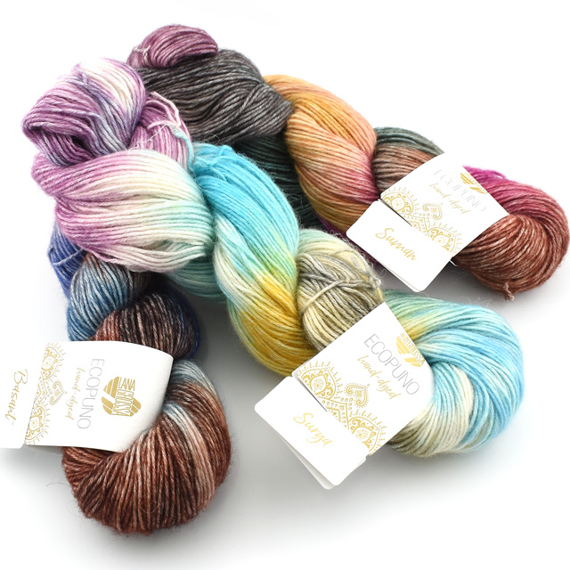 インドで手染めした糸で、手染め糸の色の出方をお楽しみいただけます。