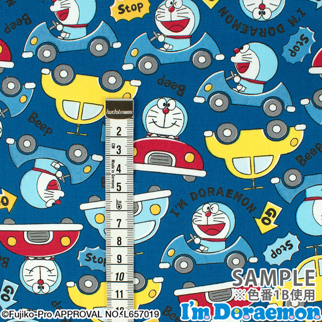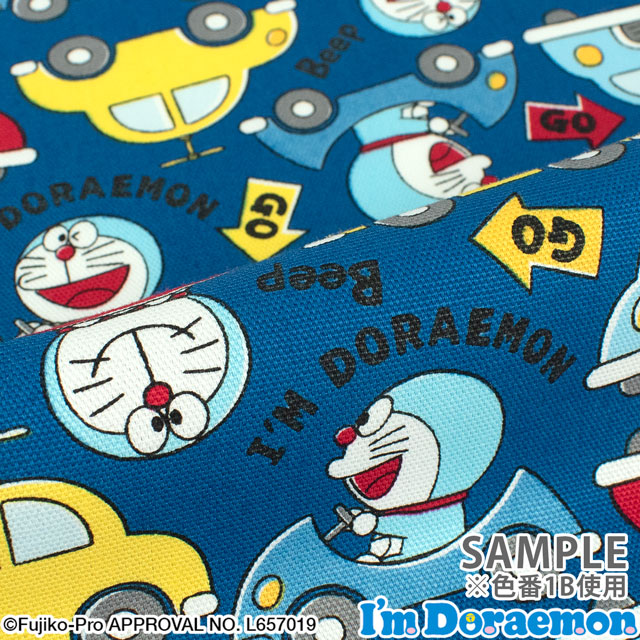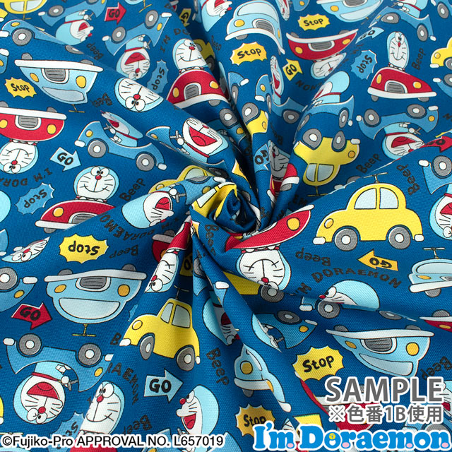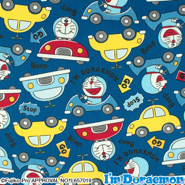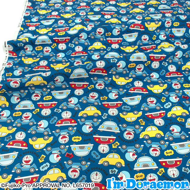 ドラえもんが車に乗って楽しそうにしているプリント生地です。