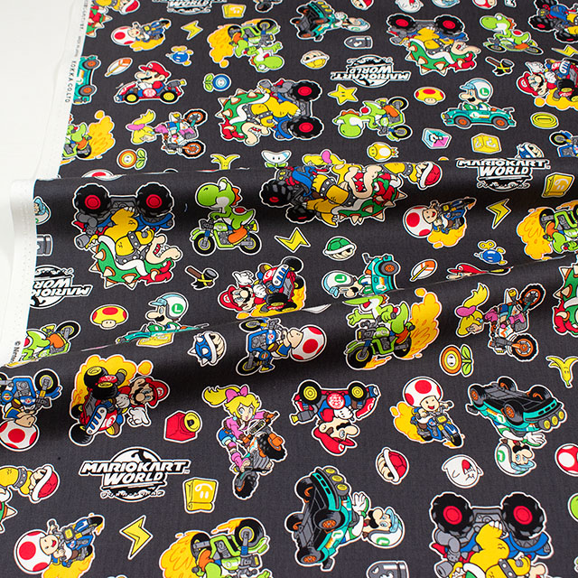 人気ゲーム、マリオカートワールドのプリント生地です。