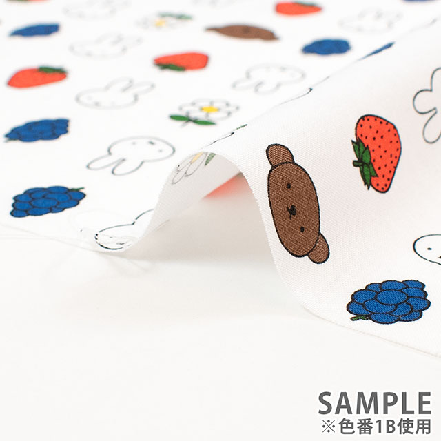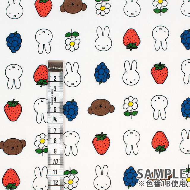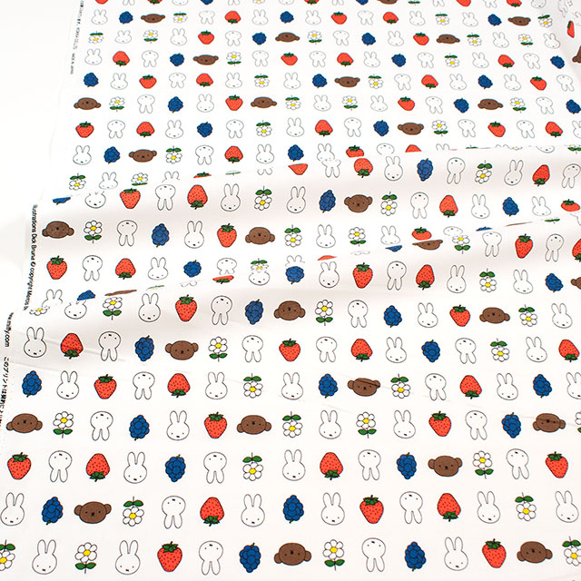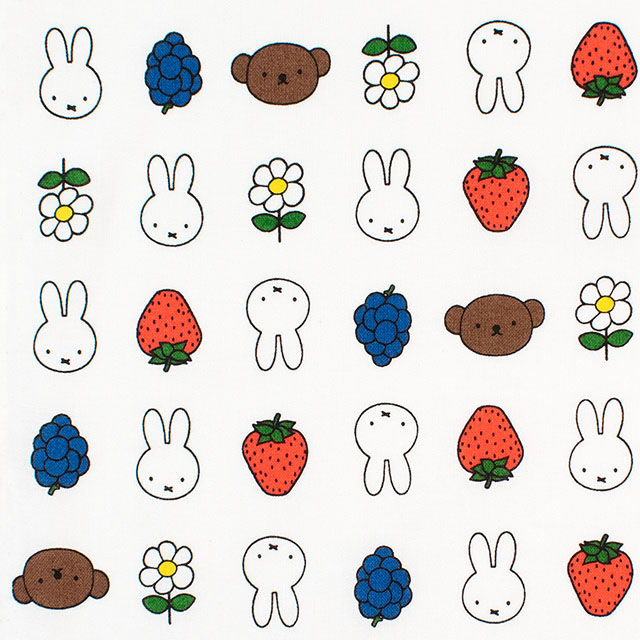ミッフィーとフルーツやお花が並んだプリント生地です。