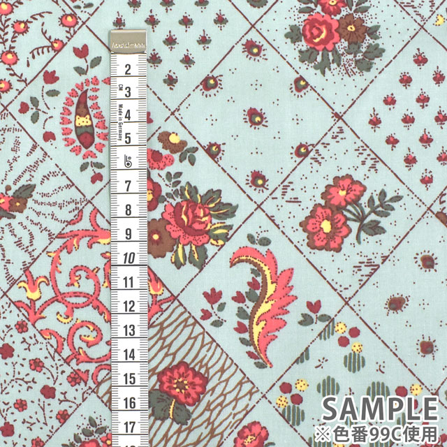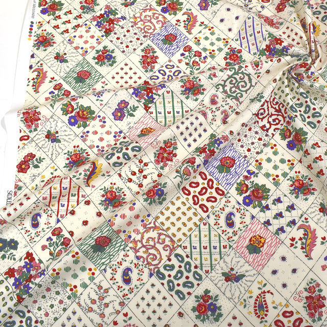 大きめの菱形格子にペイズリーや色彩の花々が大胆に配され、プロヴァンスの自然を象徴するかのように、賑やかで豊かな彩色が特徴です。