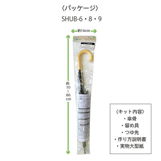 ●セット内容:持ち手付き傘骨 1本、作り方説明書、実物大型紙、つゆ先 8コ+予備、留め具 1コ