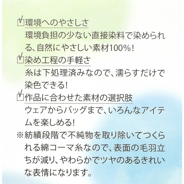 糸自体の加工は洗いと下晒し(きれいに染色できる漂白工程)と柔軟剤仕上げまで施しているので、染料定着が非常によく、手軽に染色工程をお楽しみいただけます。