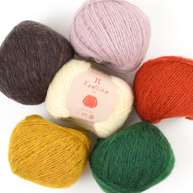 「カミーナシリーズ」は同じ編み方で同じサイズに仕上がるようにゲージを合わせてあるので、シリーズ内の異素材組み合わせなど、小物からウェアまで個性的な作品をお楽しみいただけます。