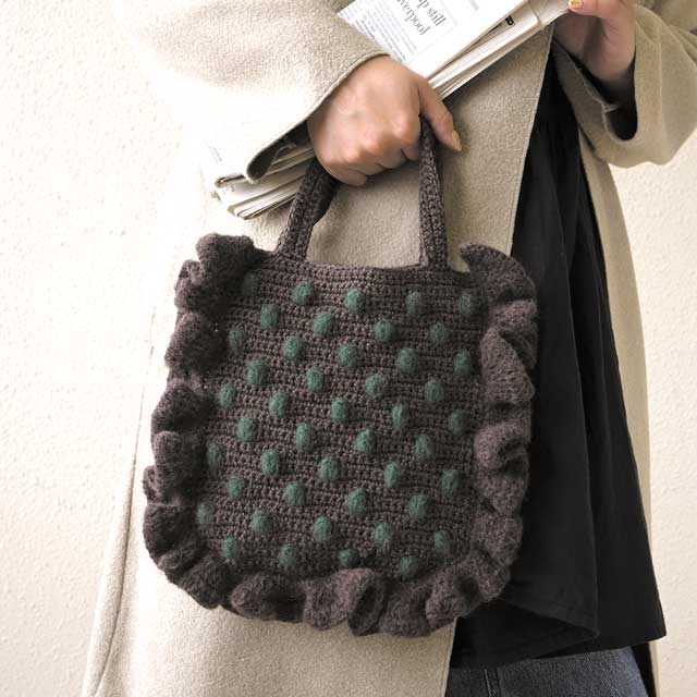 ドットとフリルがかわいいミニトートが編めるキットです。