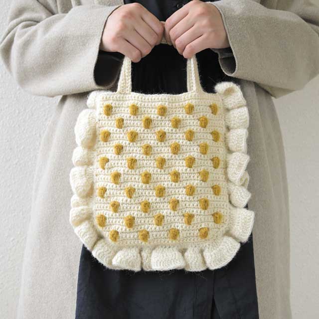 ドットとフリルがかわいいミニトートが編めるキットです。