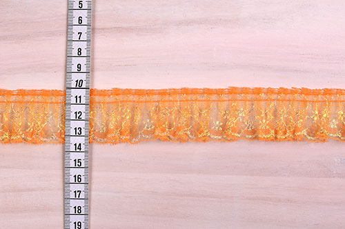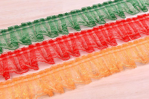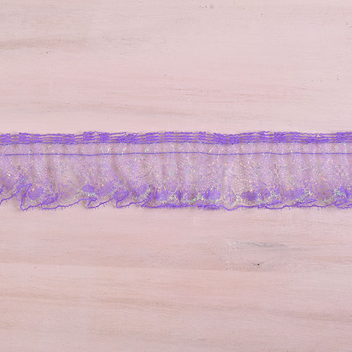 ラメ糸を織り込んだ、ボリュームあるラッセルフリルレースです。