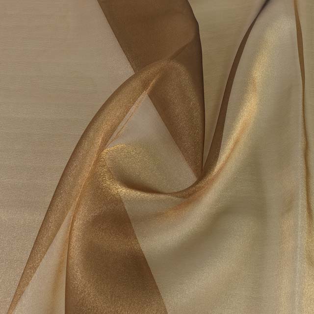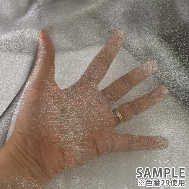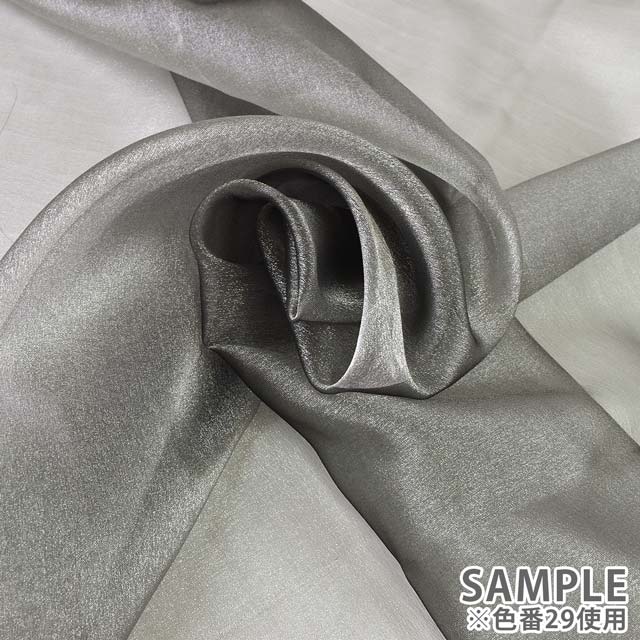 ラメ感があり光沢が強く、透け感が少ない、シャンブレー(縦横糸の色が異なる玉虫)タイプのオーガンジーです。
