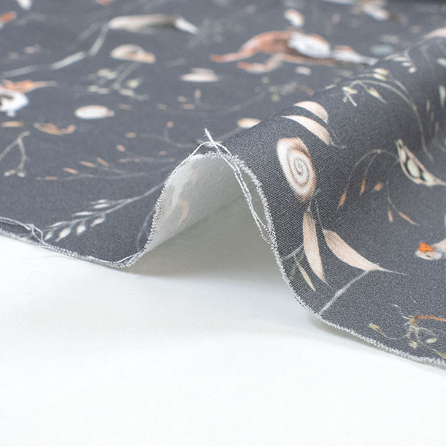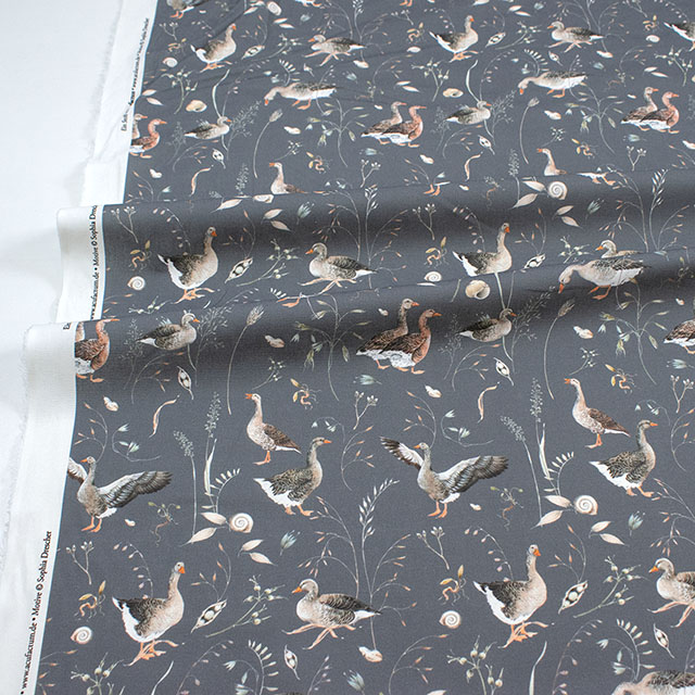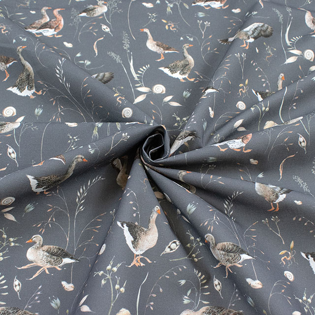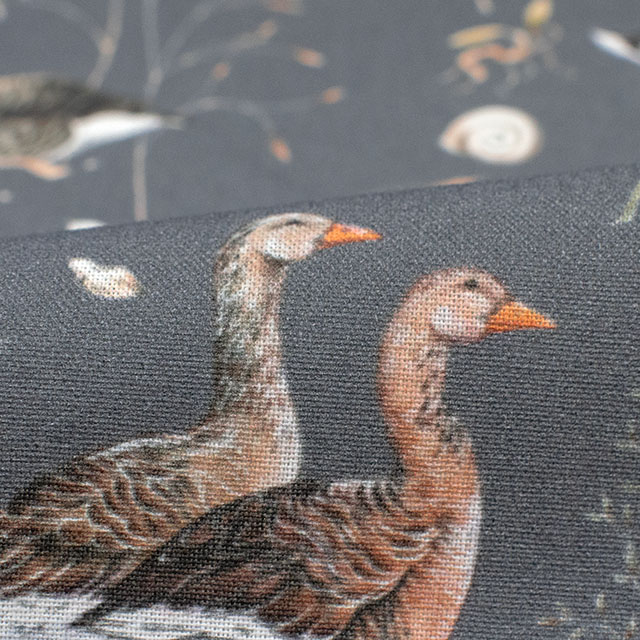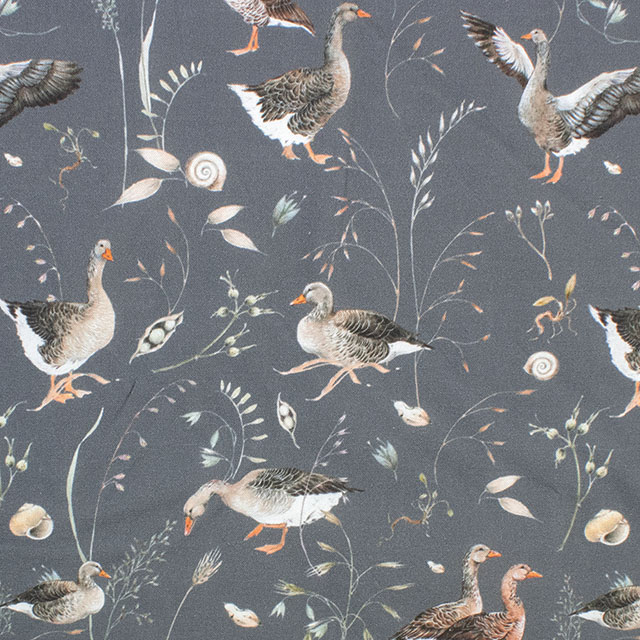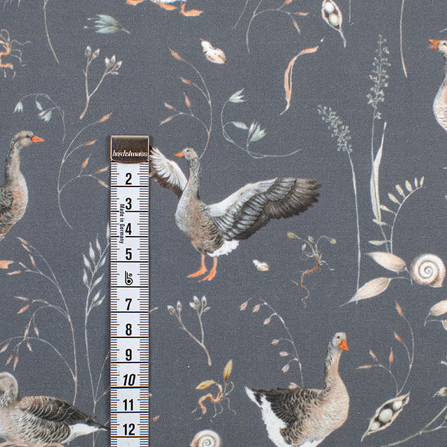 この生地には、種を蒔いた冬の牧草地と、ガチョウが喜んで近づく果物畑が描かれています。濃い背景は、明るい自然な色合いを際立たせています。