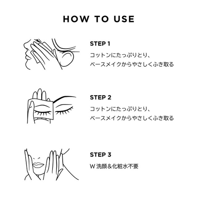コットンにたっぷりとり、ベースメイクからやさしくふき取ってください。