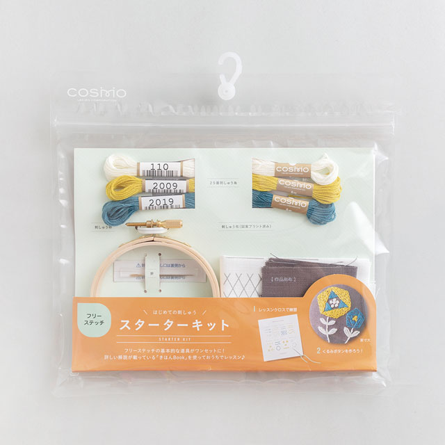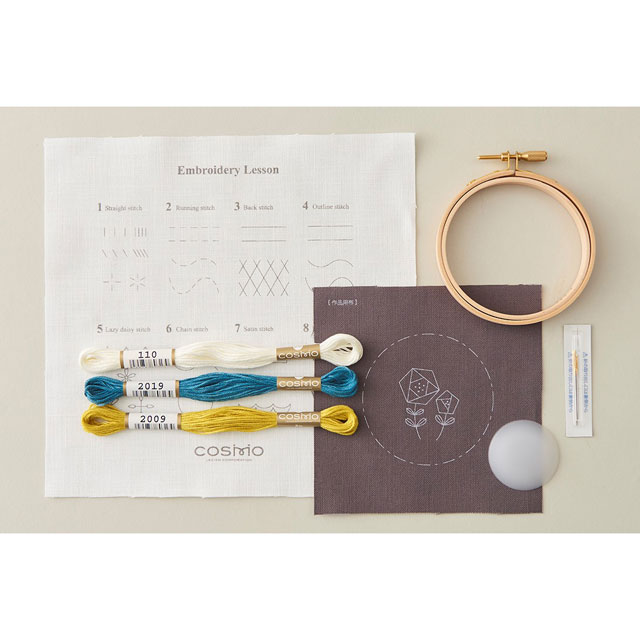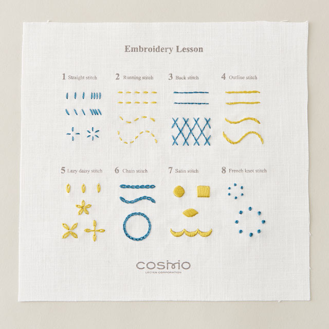 8種類の基本ステッチ(ストレートステッチ・ランニングステッチ・バックステッチ・アウトラインステッチ・レゼーデージーステッチ・チェーンステッチ・サテンステッチ・フレンチノットステッチ)がマスターできるキットです。