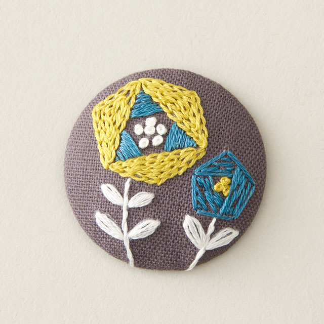- ●セット内容:図案プリント済みコットン生地ホワイト1枚、プラムグレー1枚、コスモ25番刺しゅう糸3束、フランス刺しゅう針2種各1本、刺しゅう枠8cm1個、包ボタンベース1個、作り方説明書