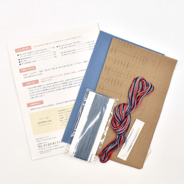 - ●セット内容:刺し子糸、刺しゅう布(図案プリント済)、フリーステッチ用コットンクロス、無地布、刺し子針、作り方説明書