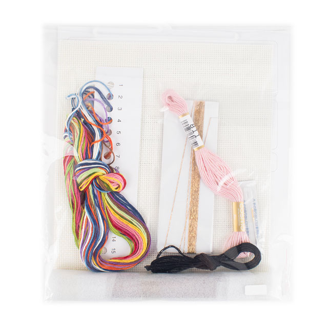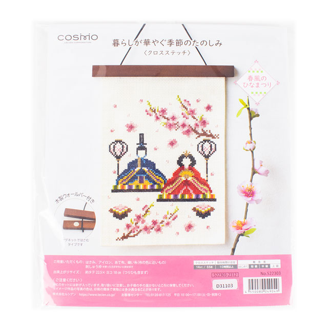 - ●セット内容:コスモ25番刺しゅう糸(綿100%)、ラメ刺しゅう糸「にしきいと」(ナイロン100%)、刺繍布(綿100%)、木製ウォールバー(天然木)、つりひも(牛革)