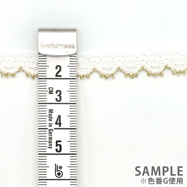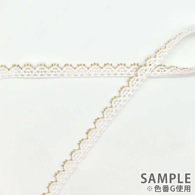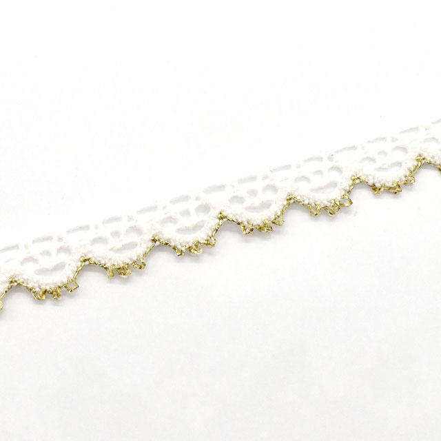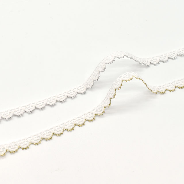 シンプルな形のレースの縁にラメ糸で装飾がされたトーションレースです。
