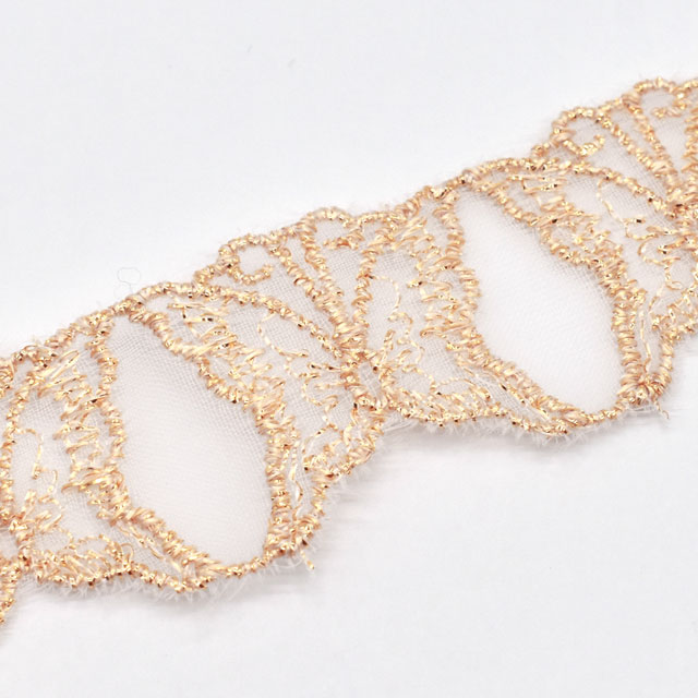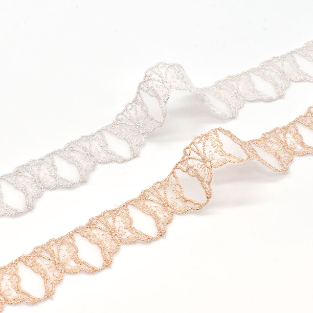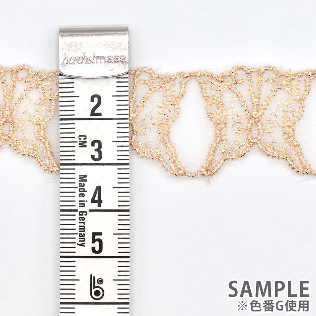 オーガンジー生地に上品な色味のラメ糸でチョウを刺繍した愛らしいモチーフレースです。