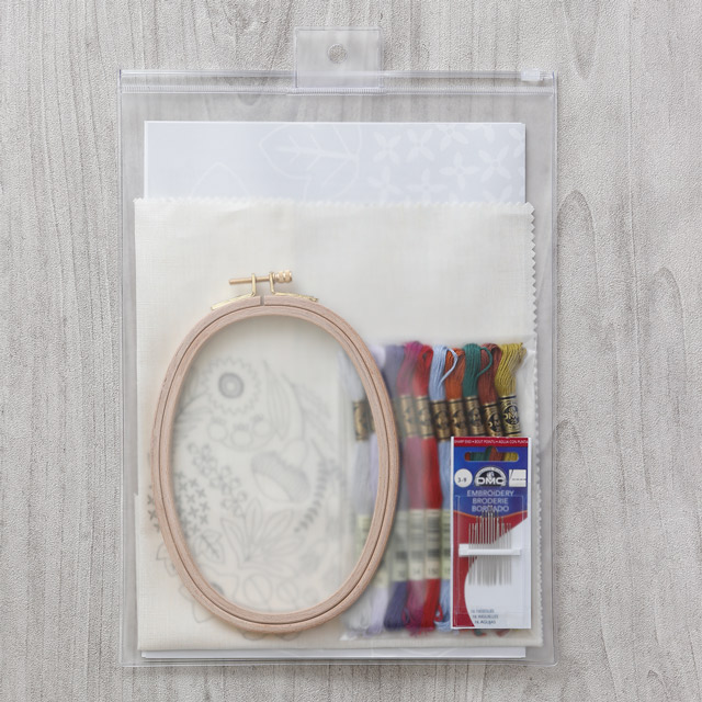布に図案がプリントされており、刺しゅう糸、刺しゅう針もセットされているので、すぐに刺しゅうを楽しむことができます。