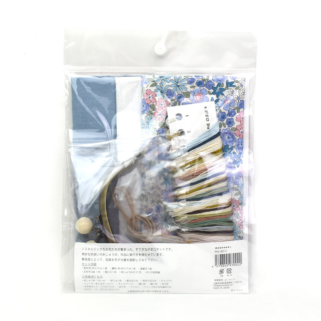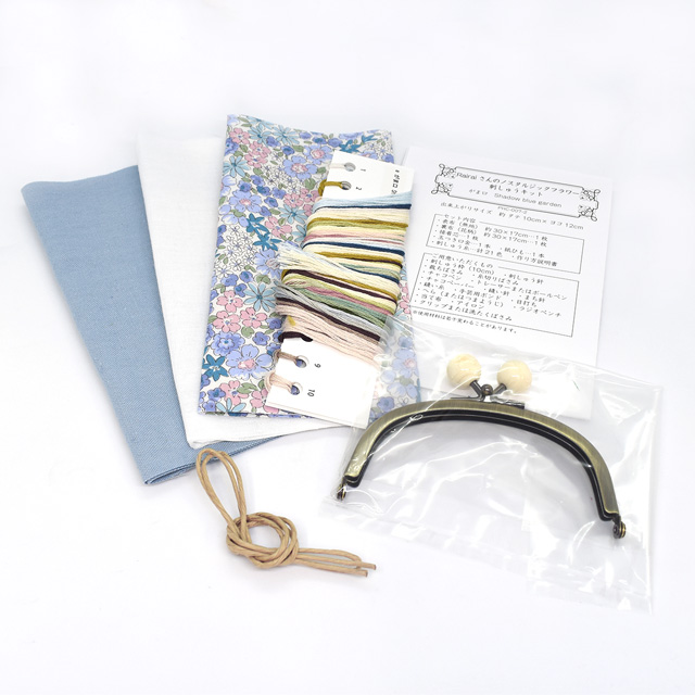 - ●セット内容:表布、裏布、接着芯、玉付き口金、紙ヒモ、刺しゅう糸計21色、作り方説明書