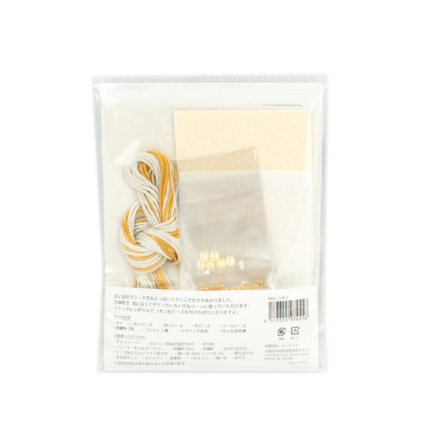 - ●セット内容:表布、丸小ビーズ、特小ビーズ、竹ビーズ、パールビーズ、刺繍糸2色、フェルト2種類、イヤリング金具、作り方説明書