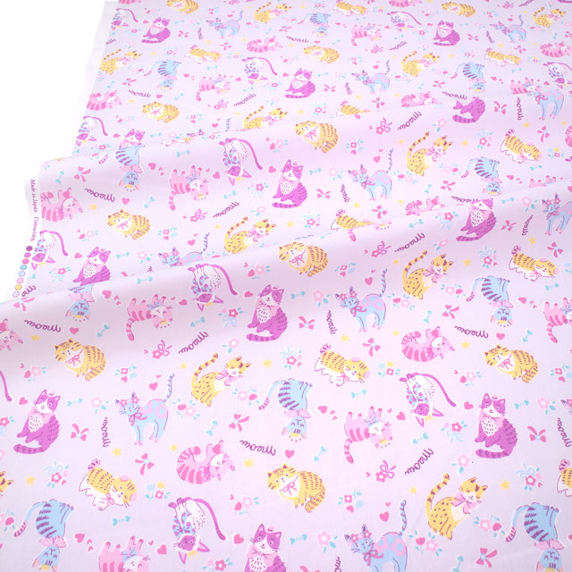 おめかししたネコちゃんがデザインされたプリント生地です。