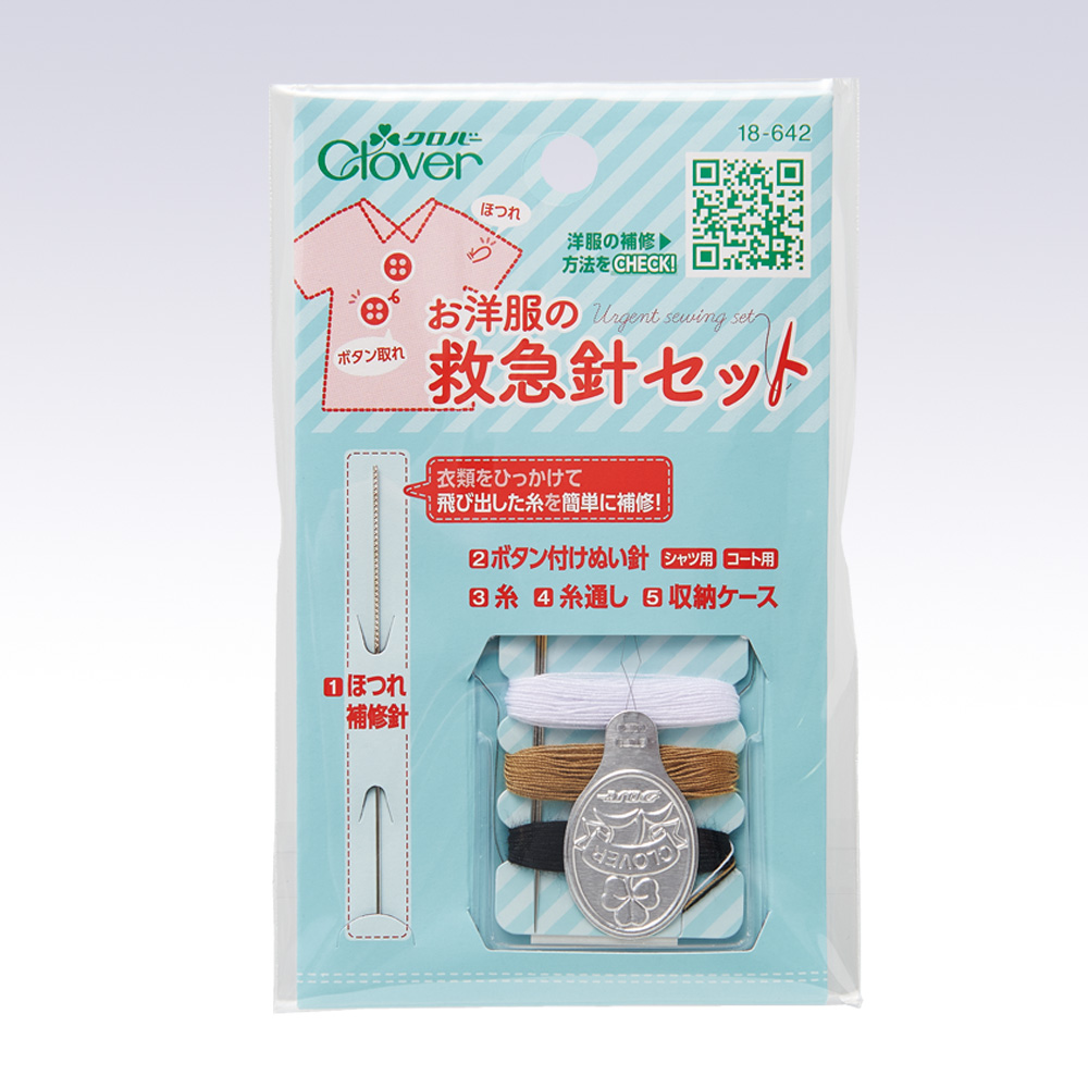 - ●セット内容:ほつれ補修針、ボタン付け縫い針、[シャツ用(三ノ二)・コート用(中くけ) 各1本]、糸(白・ベージュ・黒)、糸通し、収納ケース