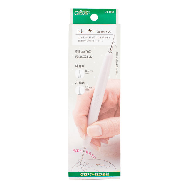 金属部分が細く長いので作業中に図案が見やすく、先端横のストレート部分は定規に当てて線を引くときに安定する形状となっています。