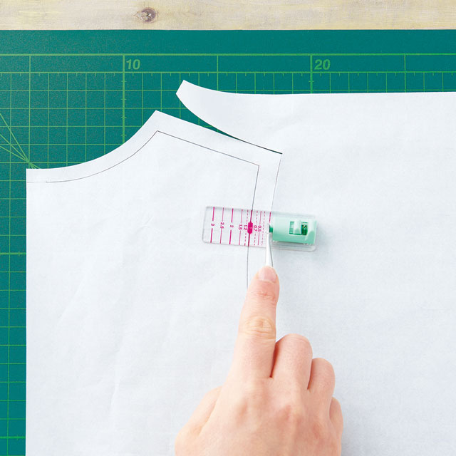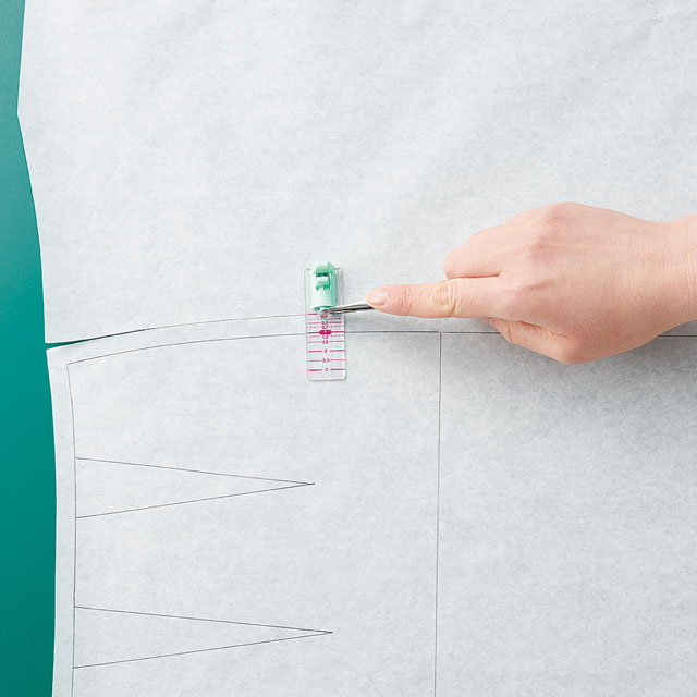 本来なら、縫い代線を「描いて」から「切る」という2つの作業をいっきに出来るので、縫い代付きの型紙が簡単に作れます。