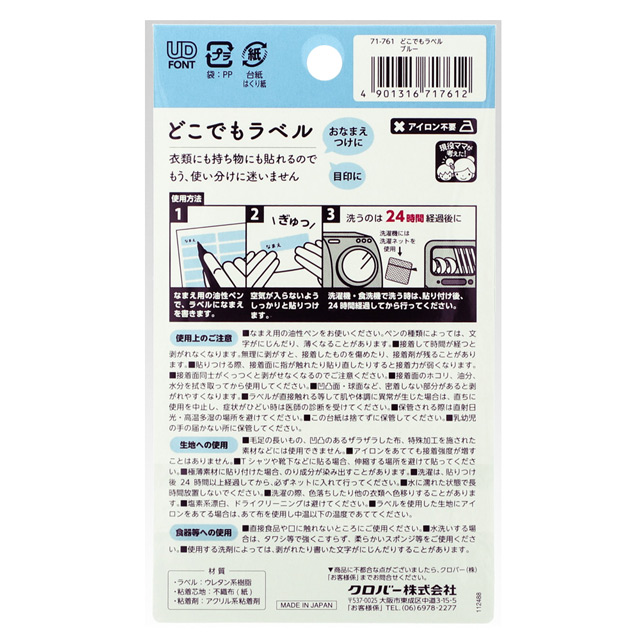 Tシャツ、ズボン、靴下などの衣類の他、コップやおはしなどの水で洗うもの、もちろん文房具など、色々なものに貼ることができるおなまえラベル。