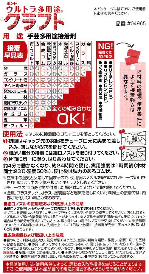 布、革、金属、プラスチックなど、様々な素材にご利用頂ける手芸用接着剤です。
