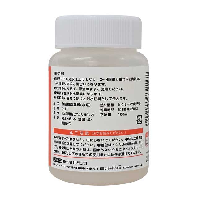 粘土をはじめ、紙・布・木・金属など、多くの素材にそのまま使用できる水性ニスです。