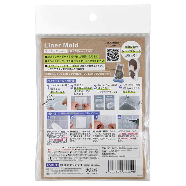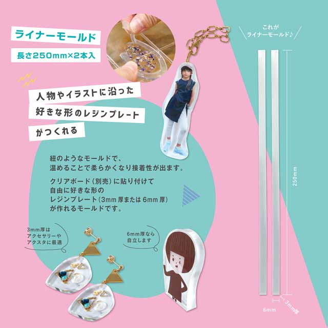 クリアボード(別売り)に貼りつけて自由に好きな形のレジンプレート(3mm厚または6mm厚)が作れるモールドです。