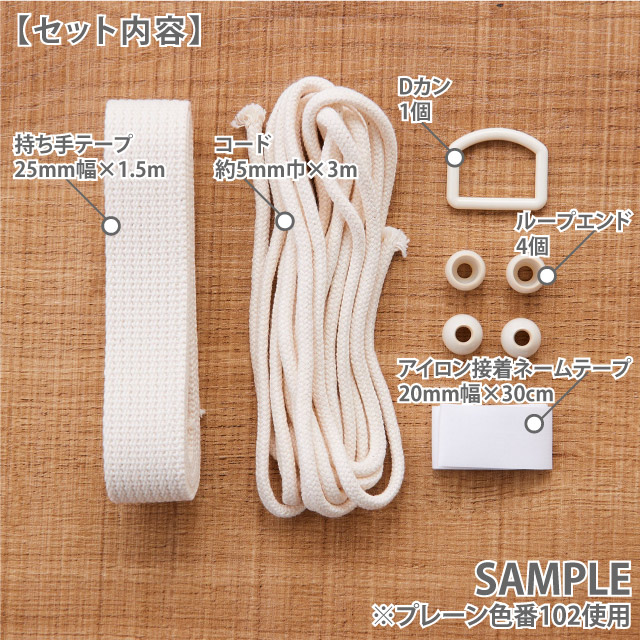 入園入学グッズのレッスンバッグやうわばき入れ、お着替え袋・お弁当袋などのセットに必要な「アクリルテープ」「アクリルコード」「Dカン」「ループエンド」がひとまとめになった副資材セットです。