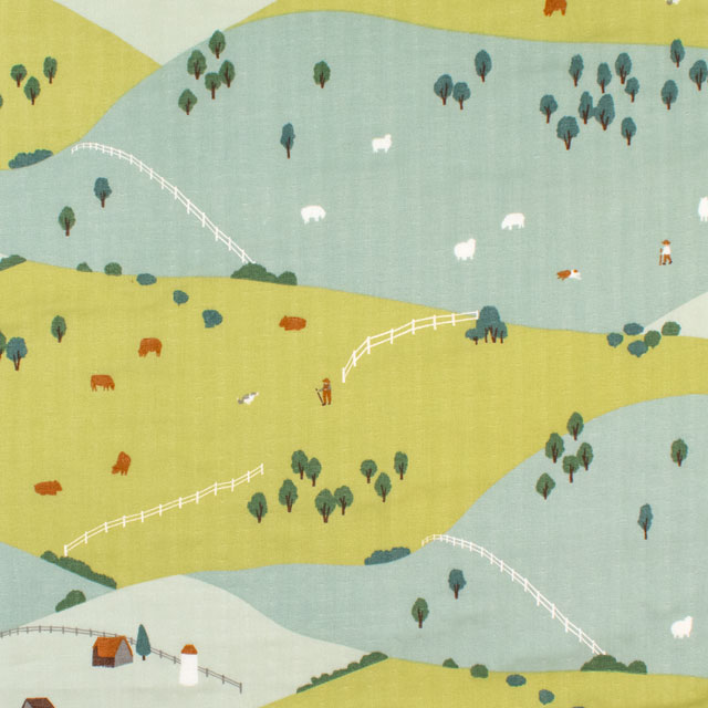 緩やかに広がる丘陵地で、牛や羊がのんびり草を食む様子が描かれた「FARM」。
