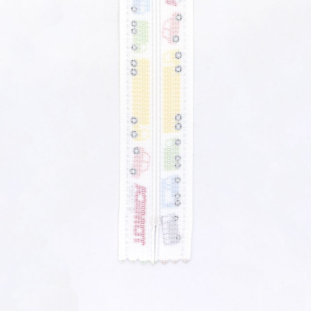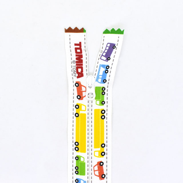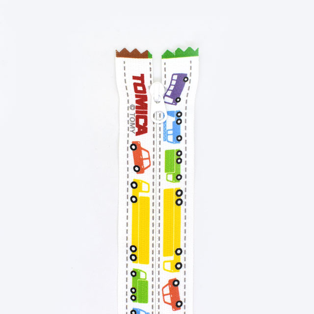 ファスナーのテープ部分にトミカのクルマがプリントされた30cmのファスナーです。