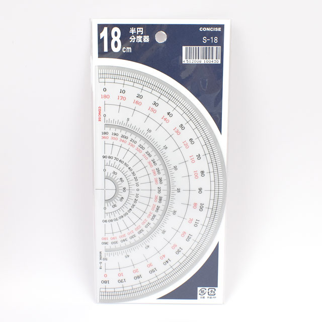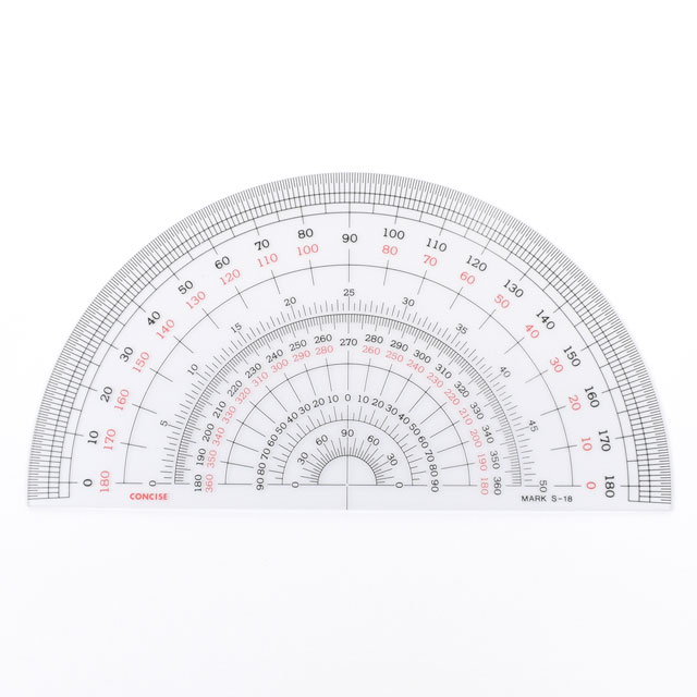 製図に適した直径18cmの大判の分度器です。
