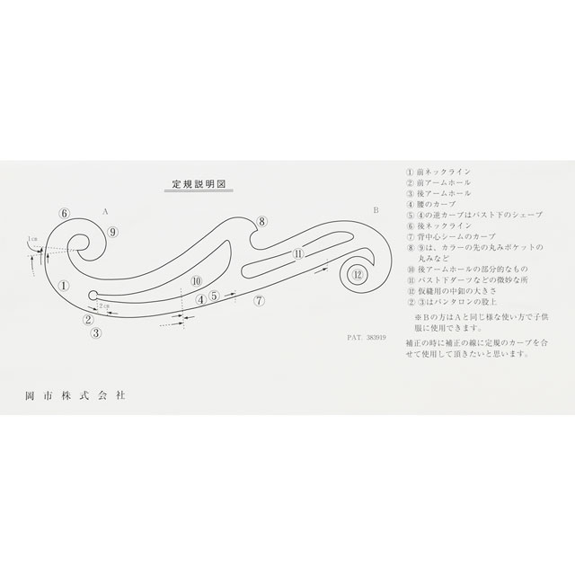 カーブの深いところは袖ぐり襟ぐりに、浅い部分では腰の丸みなど書きたいカーブが見つかる定規です。