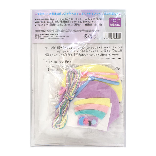 - ●セット内容:型抜き済フェルト、刺しゅう糸、リボン、ラインストーン、綿、作り方説明書